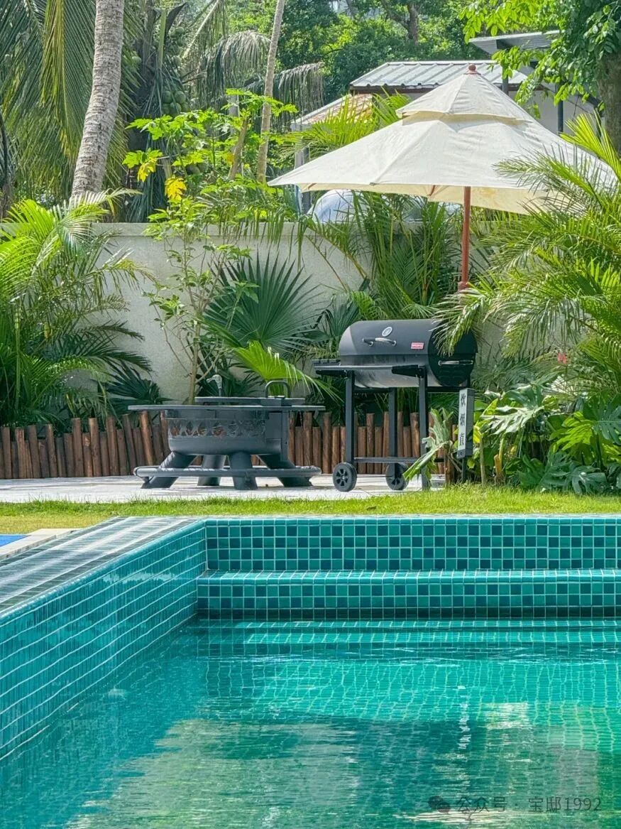 走出房间,便是充满诗意的田园风庭院。庭院中,高大挺拔的椰子树宽大的叶片在微风中沙沙作响,井水灌注的泳池碧波荡漾,你可以在庭院中放置的休闲躺椅上悠然自得地晒晒太阳,看孩子们在天然无污染的泳池中自由扑腾,或是与同行的伙伴们围坐在一起围炉喝茶,谈天说地,享受悠闲惬意的时光。