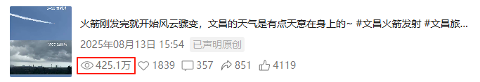 2025年8月14日,汇志传媒旗下的新媒体账号“寳邸1992”推出单条视频《文昌火箭发射,有天意?》播放量突破425w、总互动破1w!